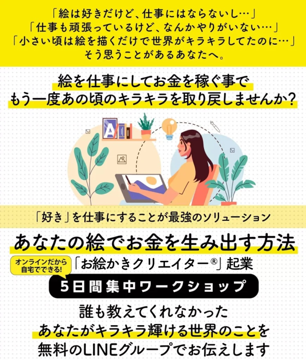 あなたがつくった1つの作品が月の月収以上で求められるというのはイメージできますか?実は、イラストが数千円〜数万円まででしか売れなかったのには根本的な原因があったんです。この原因を解決し、たった1つの作品で数十万円で受注できる方法をお伝えしていきます。
